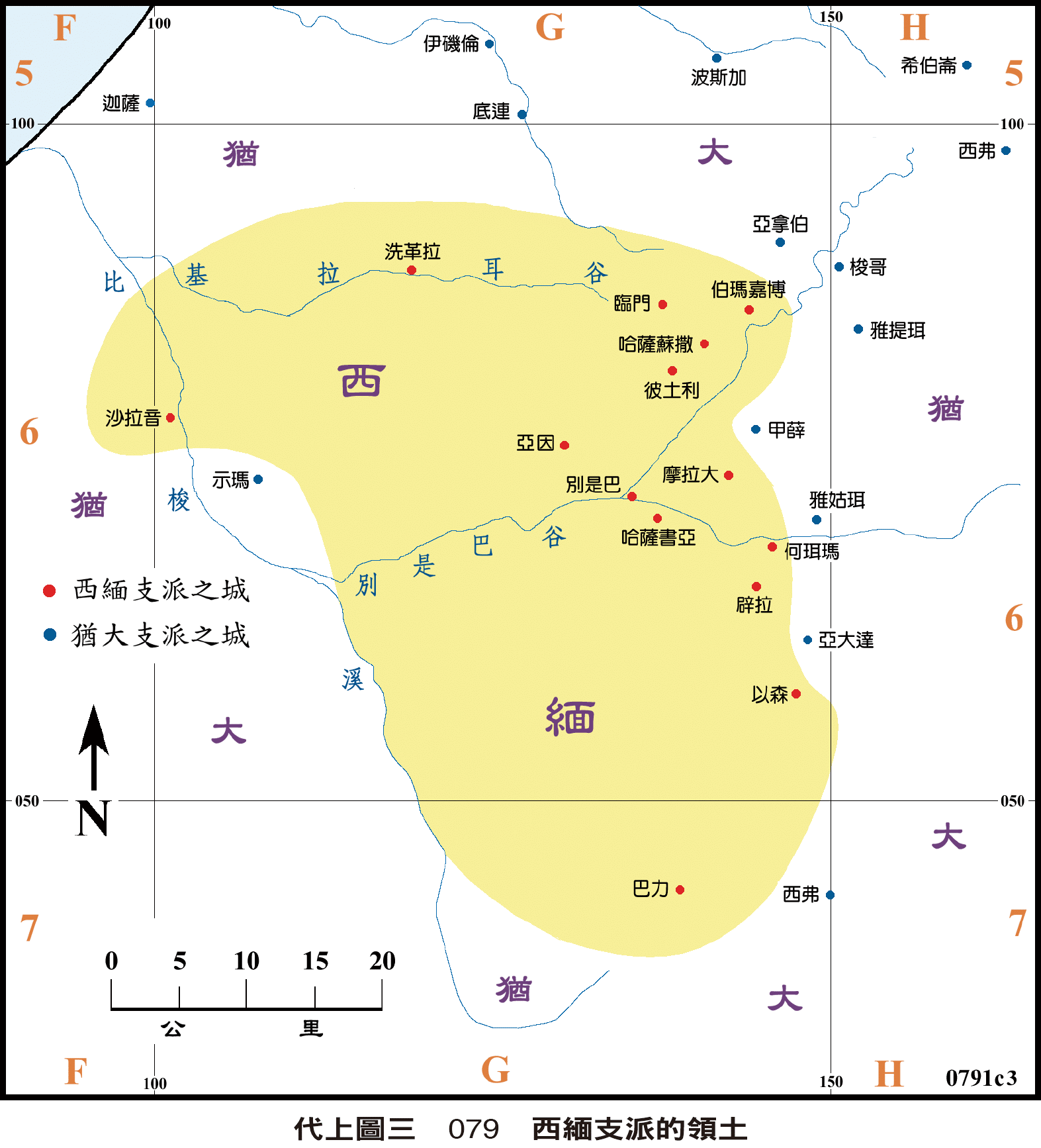 | 78 代上圖二 078 迦勒的子孫所居之城 | 79 代上圖三 079 西緬支派的領土 |